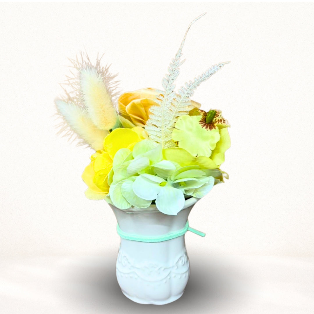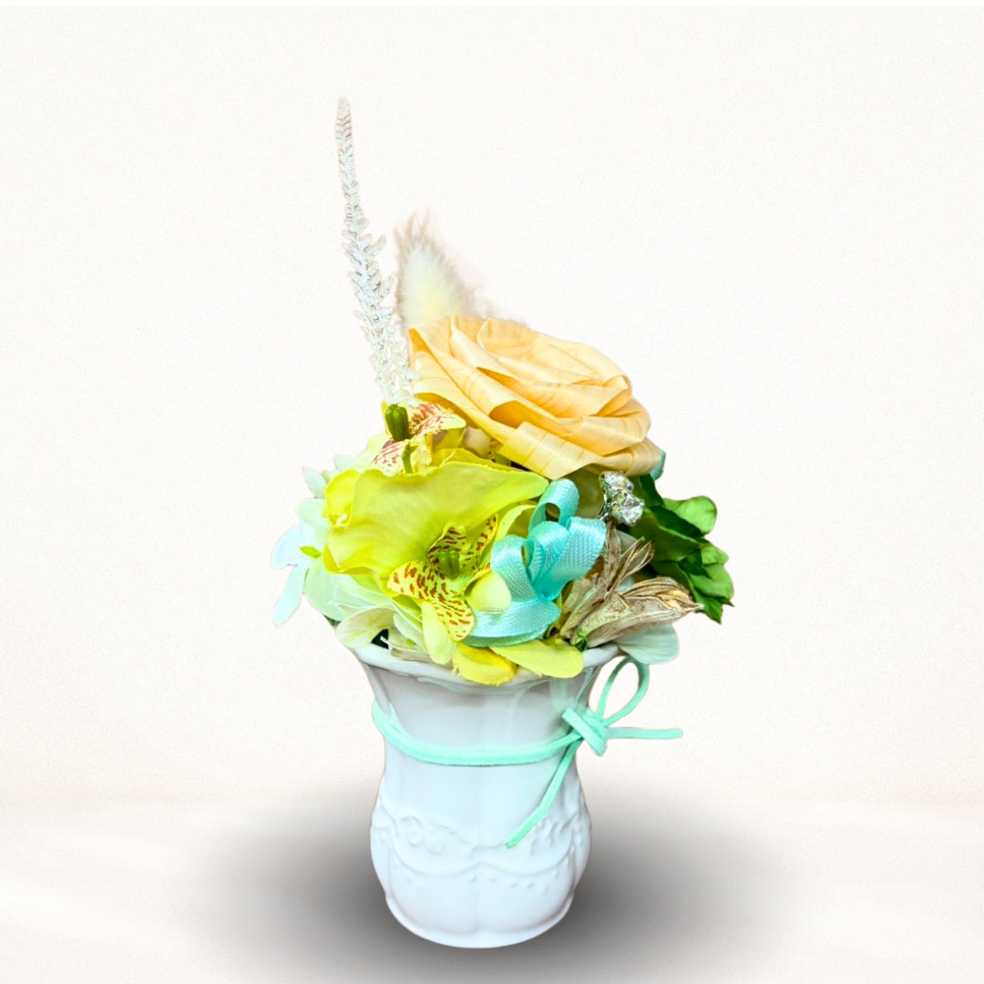 やさしいイエローのバラを中心に、ミントグリーンや淡いグリーンを合わせた小ぶりで飾りやすいフラワーアレンジです。