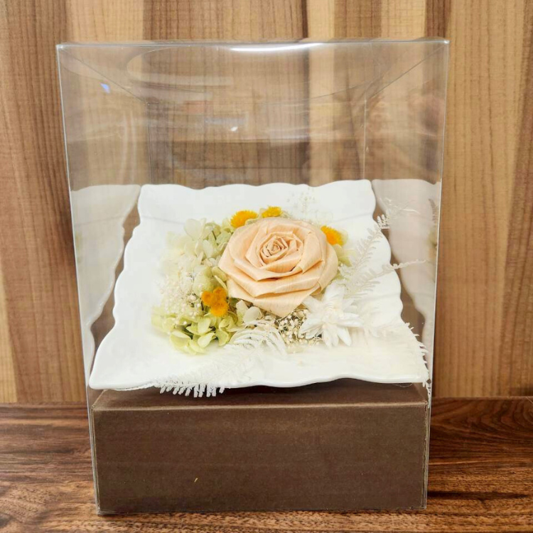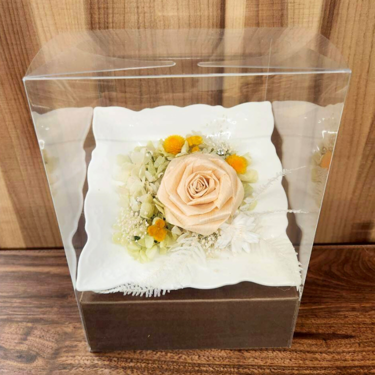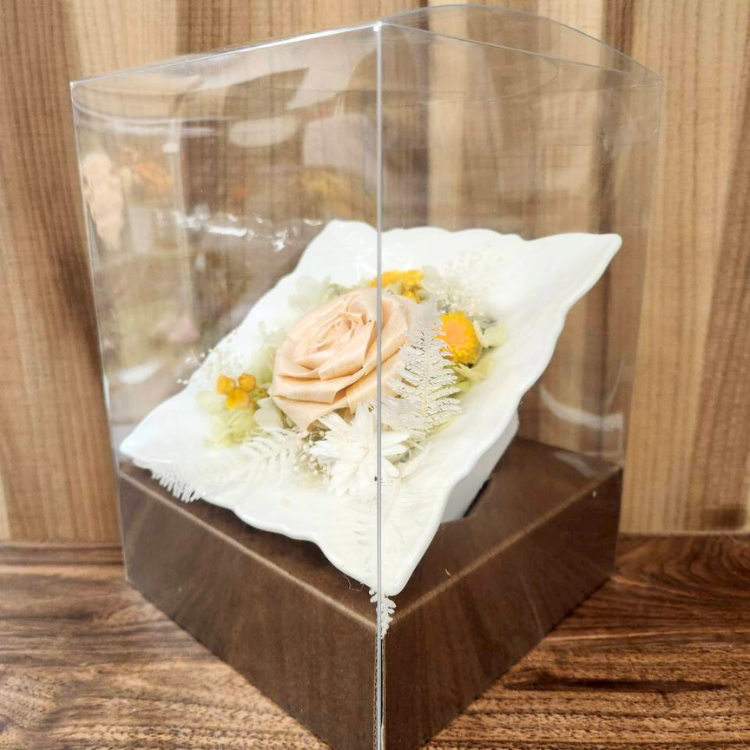 美しい陶器プレートに立体的にアレンジされた花々は、飾るだけでお部屋をパッと明るくしてくれるインテリアギフト。