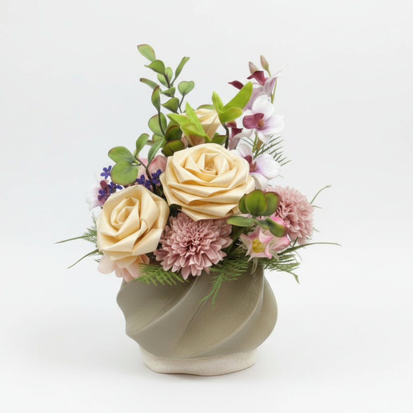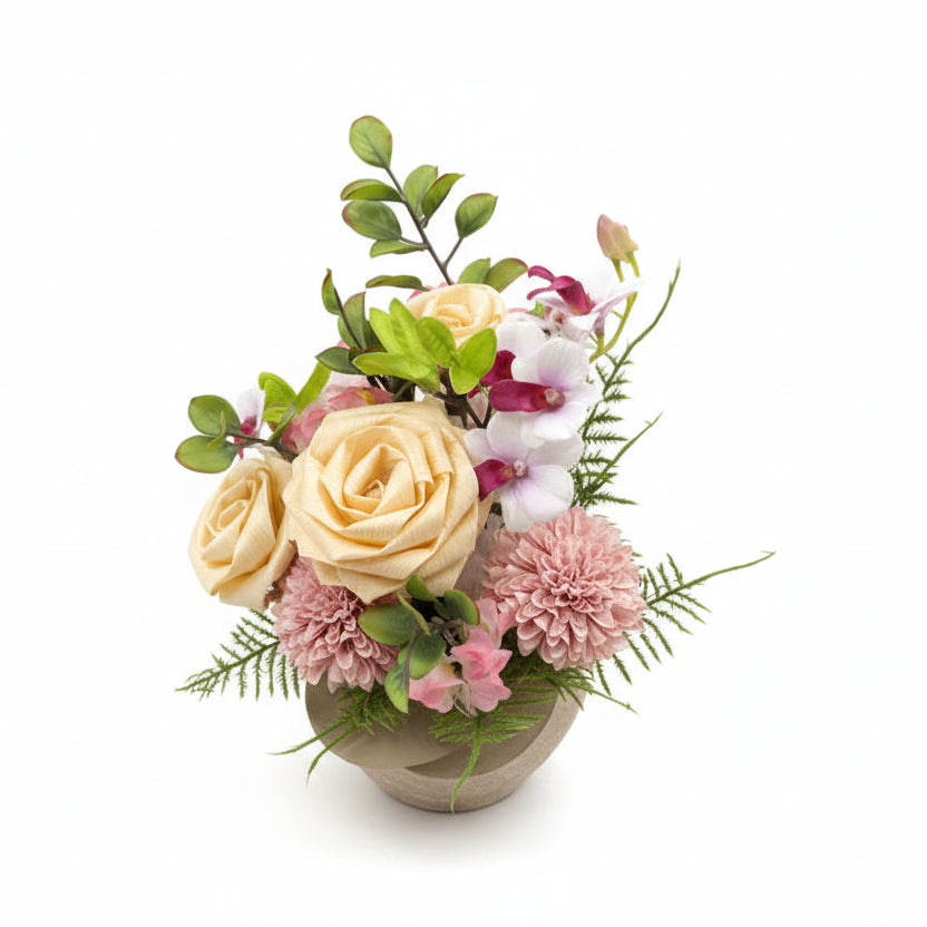 やさしいナチュラルローズとピンクマムを合わせた上品なフラワーアレンジメントです。