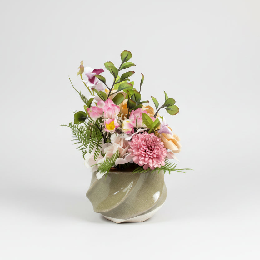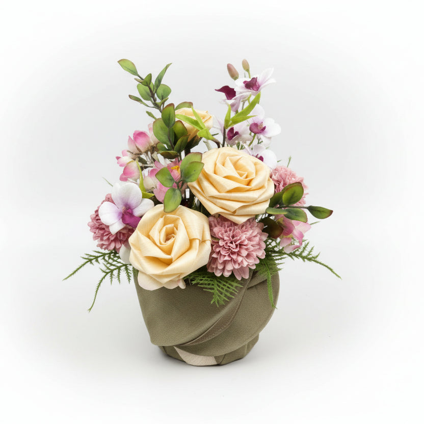 落ち着いた色合いのひのきろうずに、可愛らしいピンクの花々とグリーンを添え、お部屋にやさしい華やかさをプラスします。