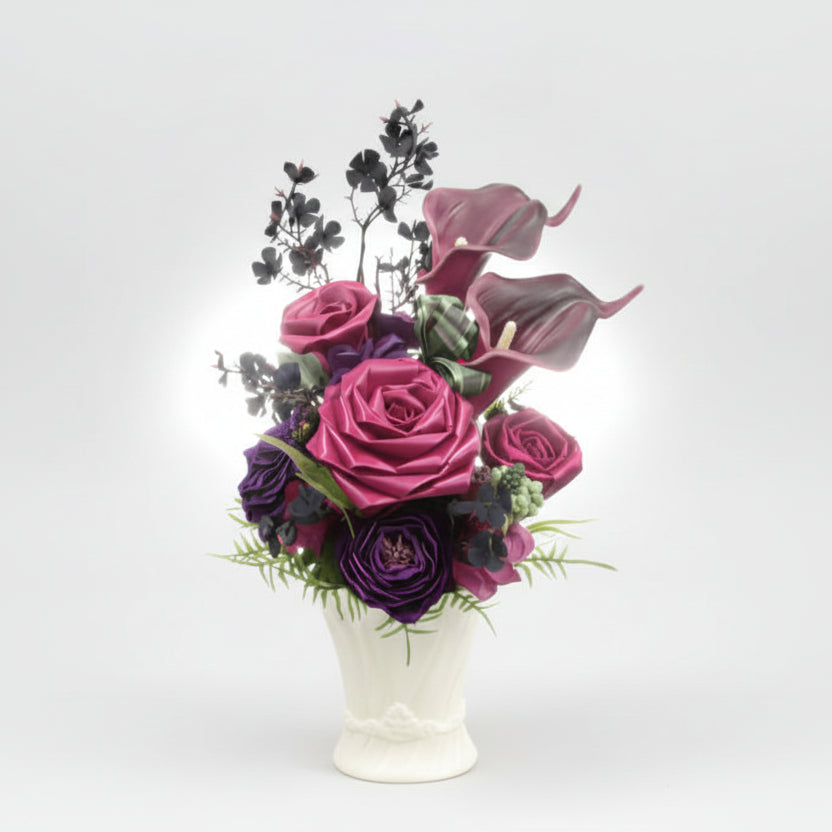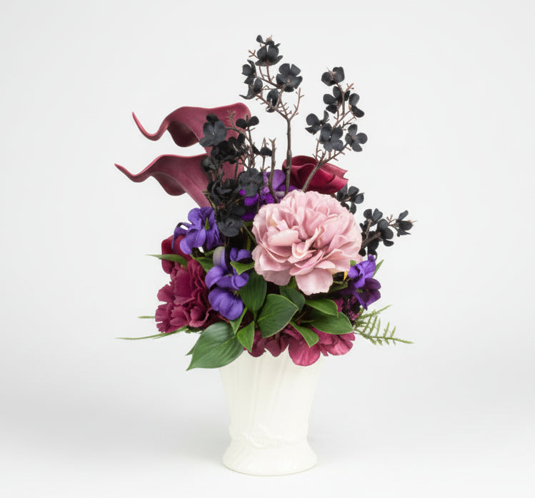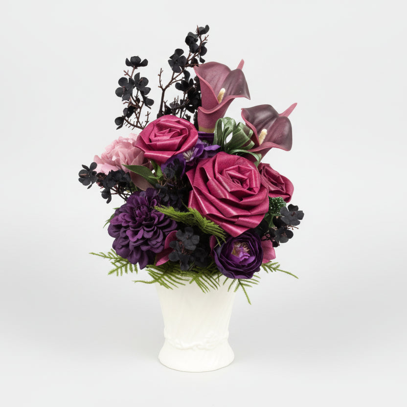 深みのあるボルドーのひのきろうずを主役に、ブラックやパープルの花材を合わせた、洗練された大人のフラワーアレンジメント。