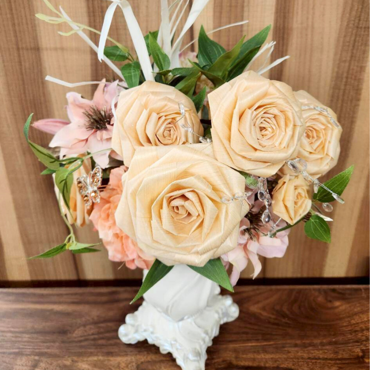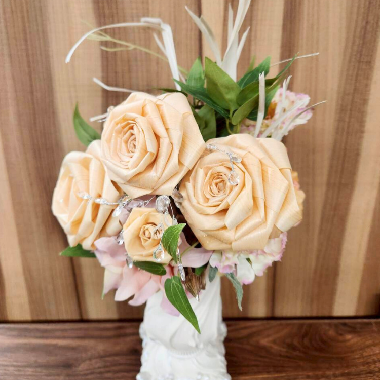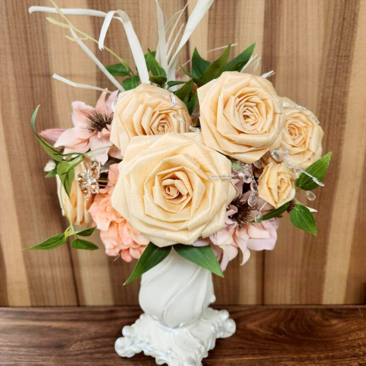 白の陶器風ベースにあしらわれた薔薇は、繊細な手仕事によって一枚一枚重ねられ、まるで本物の花のような佇まい。