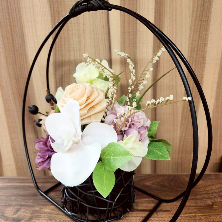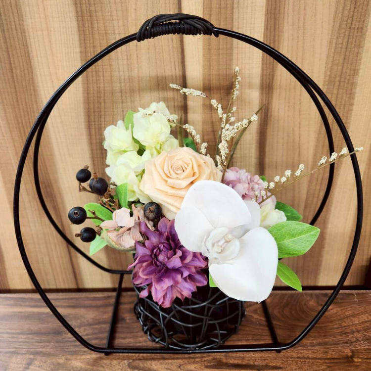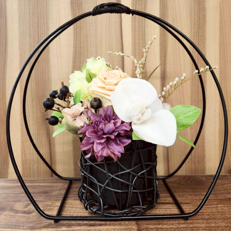黒のワイヤーベースに、上品さと柔らかな彩りの花々をバランスよくあしらった和モダンアレンジメント。